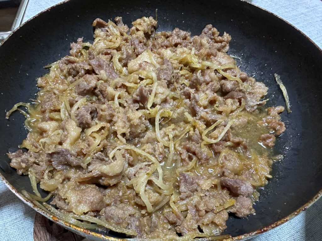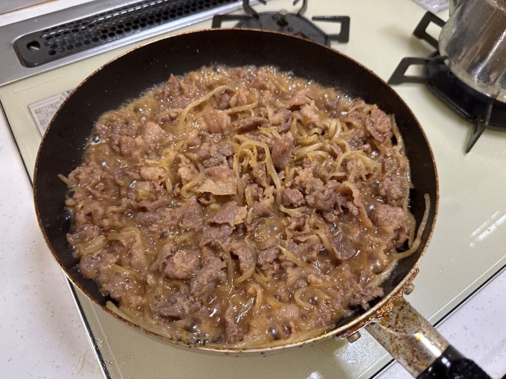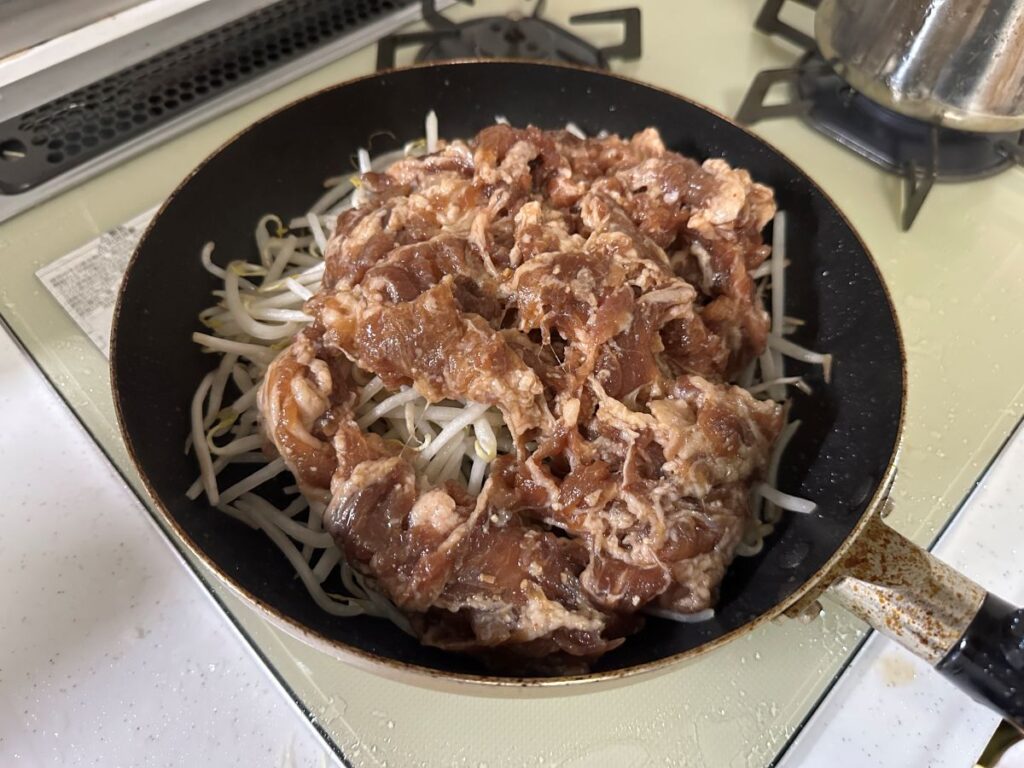 こちらをもやしと共にフライパンに全量投入して煮ます。そう、味付けジンギスカンは焼くのではなく煮るのです。