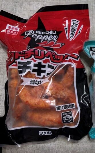 白身フライ10枚で10枚で368円。動画でも絶賛されていたレッドチリペッパーチキン500gで528円。味はほぼLチキレッドとのこと。