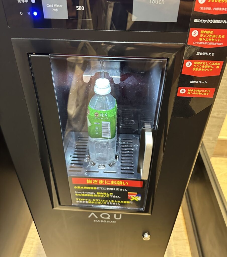 実際の水素水の機械がこちら本当は水素水用のボトルを置くらしいのですが、持ってないので空になったお茶のペットボトルです。ちゃんとこぼれずに500ml満タンになりました。多分良くないと思うので水筒買いますね。持っている水筒は300mlの物しかなくて。