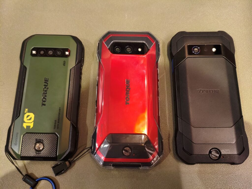 京セラのラフネススマホ。左からTORQUE G06 KYG03、TORQUE 5G KYG01、DuraForce EX。DuraForce EXだけ名前がTORQUEシリーズではありませんが、こちらはビジネスモデルとして法人向けに販売されている端末です。どれも防水防塵性能はあるのですが、TORQUEシリーズは海水にも耐えられる設計に対してDuraForce EXは海水までは保証されていません。USB端子がキャップレスであり、キャップ無しのイヤホン端子も付いています。工事現場や工場等での使用までは考えていますが、海までは想定していないモデルです。代わりにDuraForce EXには電源オフにせずにバッテリー交換が出来るホットスワップ機能が付いています。お仕事は止められませんからね。