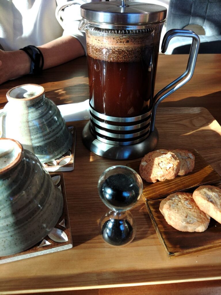 砂時計が落ちてから上のレバーを押してコーヒーを淹れるプレス式コーヒーを出してくれるお店です。コーヒーも美味しく、また取り忘れですがここから見られる風景も大変良いです。