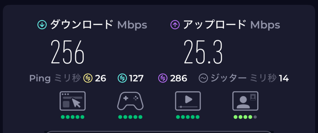 下り30Mbps程度。まぁ十分と言えば十分ではないでしょうか?最大16台まで同時接続可能。2027年9月末までと約1年半程度無料で使用が出来るわけですから何の不満もありません。