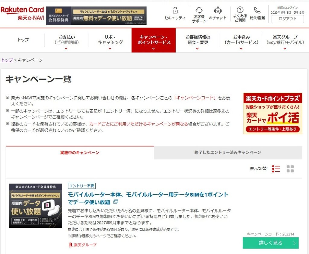 楽天ビジネスカードが届いたあと、きっとキャンペーンお知らせメールが届くんだろうなぁ?と首を長くして待ってたのですが、全く届かず!!もしかしてと楽天カードを管理する楽天e-NAVIにログインして見てみると
