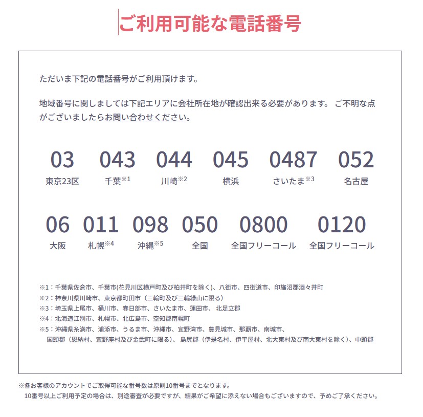 月額基本料金は番号代100円+980円と太っ腹。子機(子スマホ?)が増えても一つ980円で追加して最大でも4900円で止まります。もちろん内線通話も転送も可能。時間帯によってとる子機を変えたり、自動アナウンスに変えたりも出来るんです。もう普通の電話よりお得だと思います。欠点はちょっと音質が劣化するところです。03番号等とある通り、さまざまな地域の電話番号を取得できます。